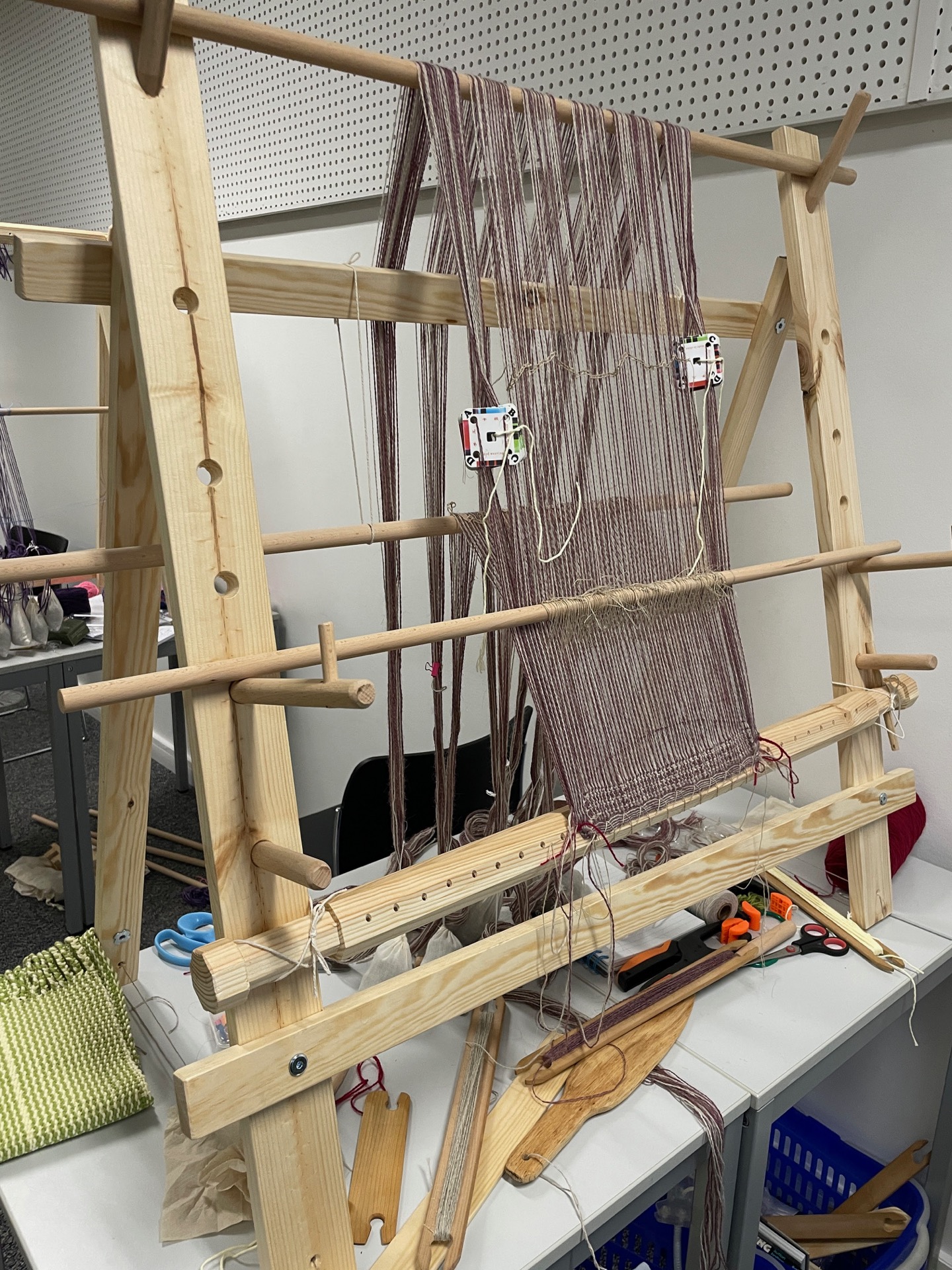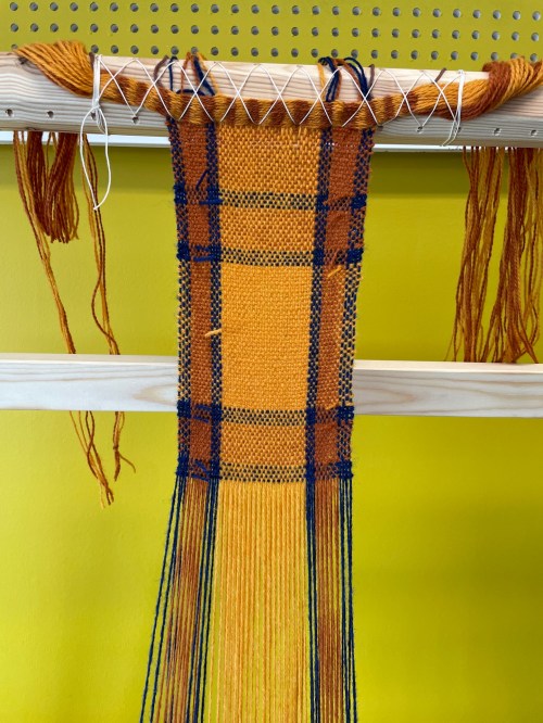 Morning – finish weaving my ‘2025 Summer School Unofficial Plaid’ and adding wool locks as a fringe at the bottom.