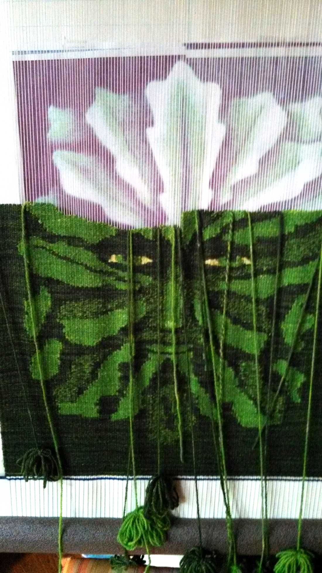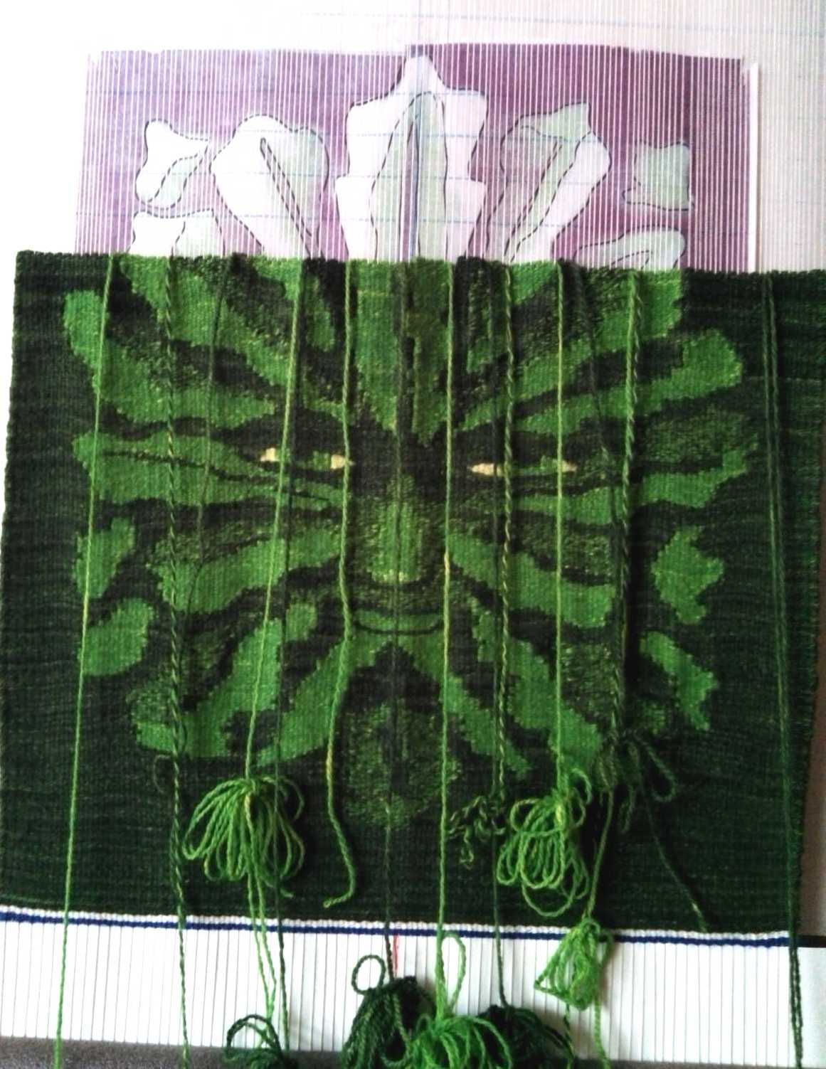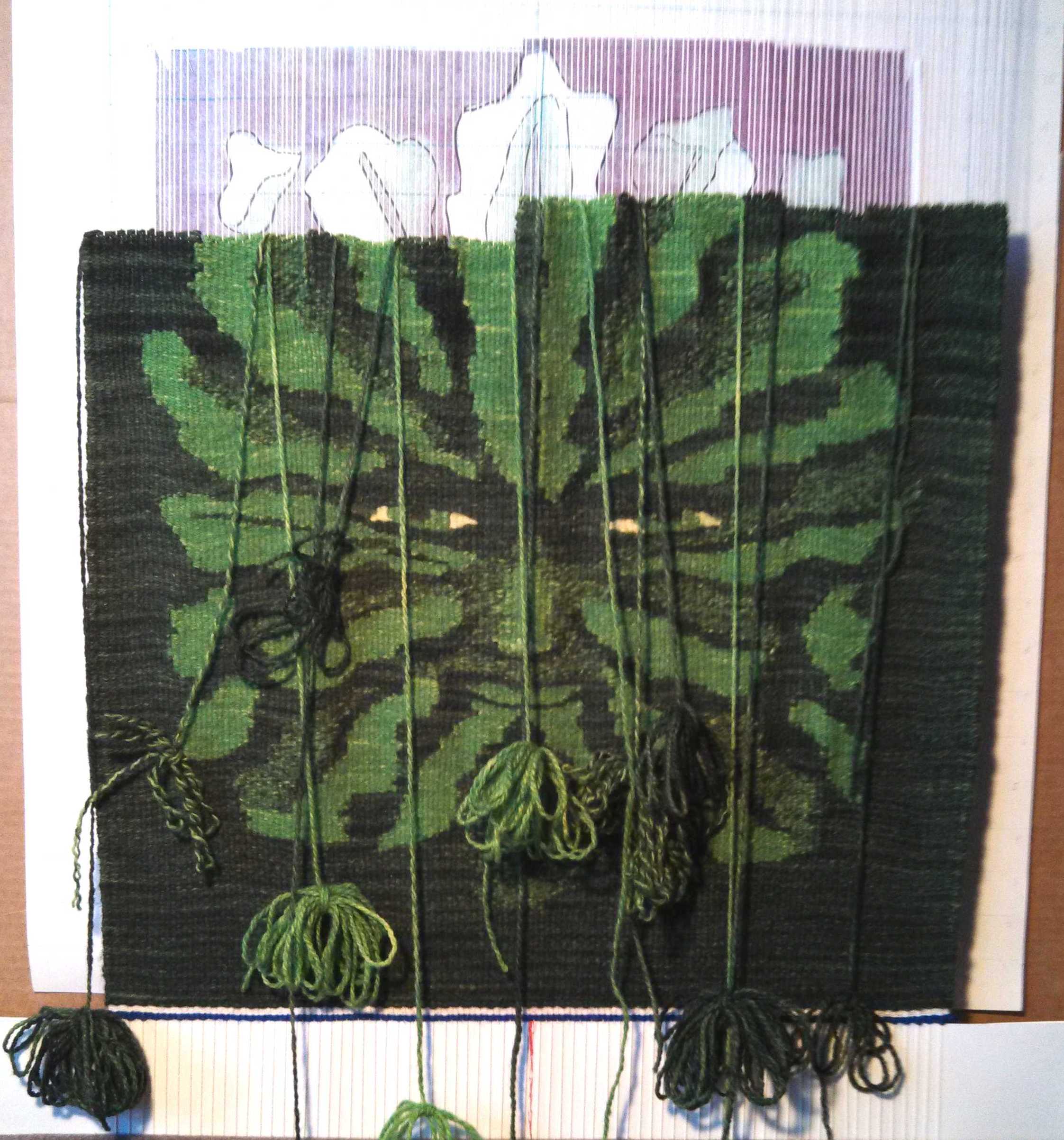 Now the finishing work began: all the warp threads knotted and secured, the long gap in the center forehead leaf sewn shut, clean up the back (weave in/sink the weft ends), plus there was a lot of rippling in the tapestry because my warp tension had become very uneven.
